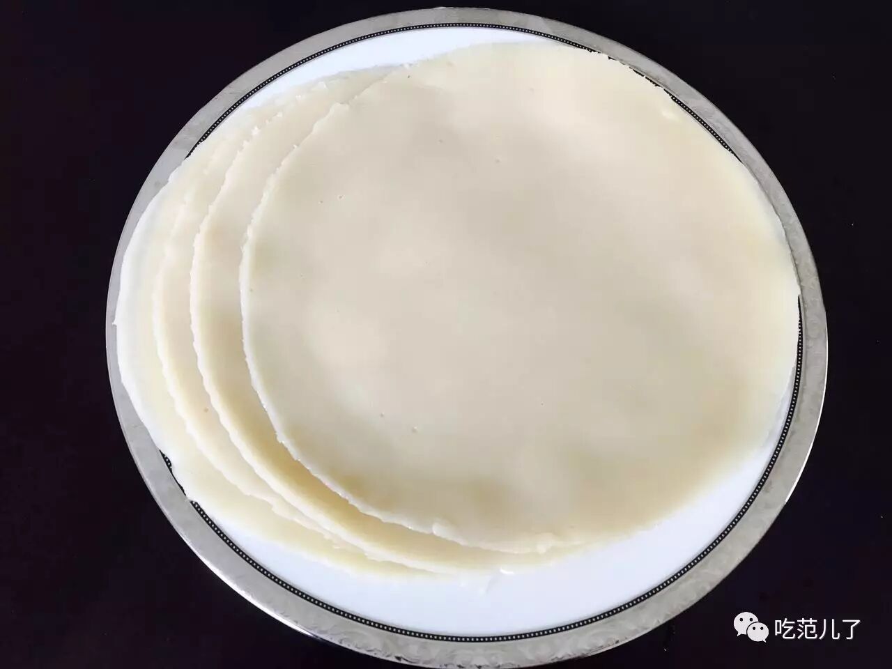 4.圆形烤盘刷一层很薄的油。舀起一勺面浆到烤盘晃动均匀
