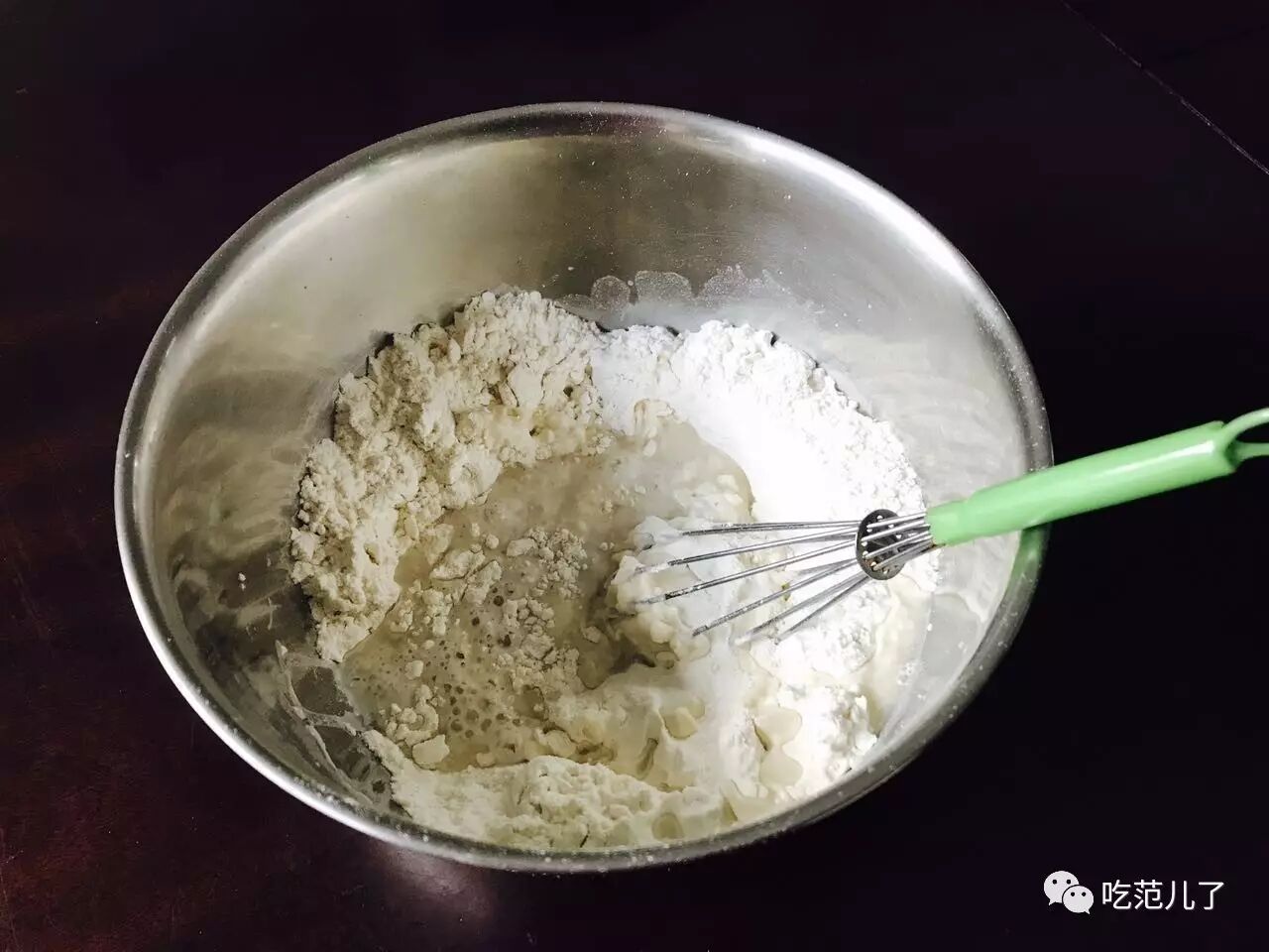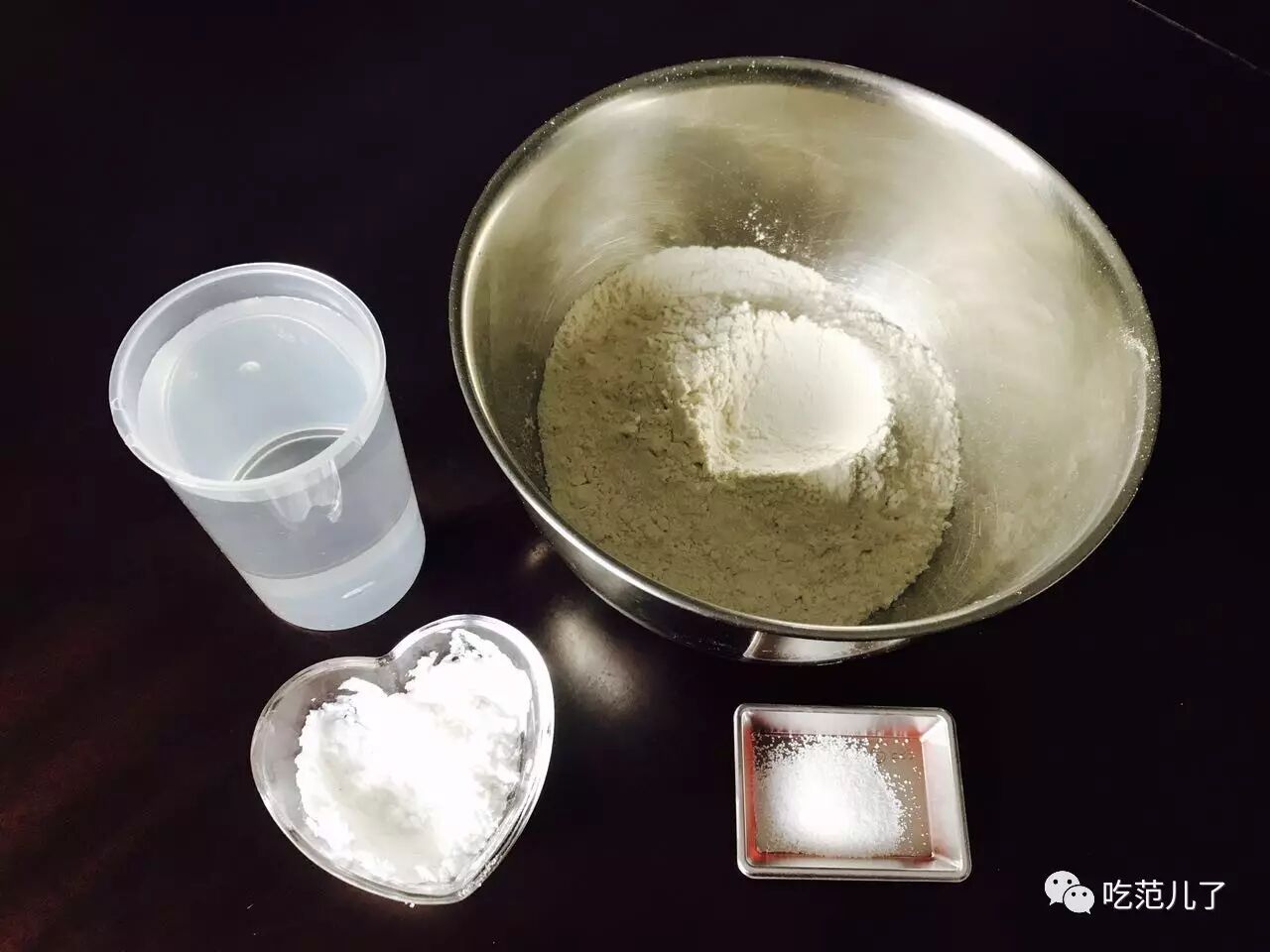 1.高筋面粉、玉米淀粉、盐混合。分次加入清水慢慢搅拌