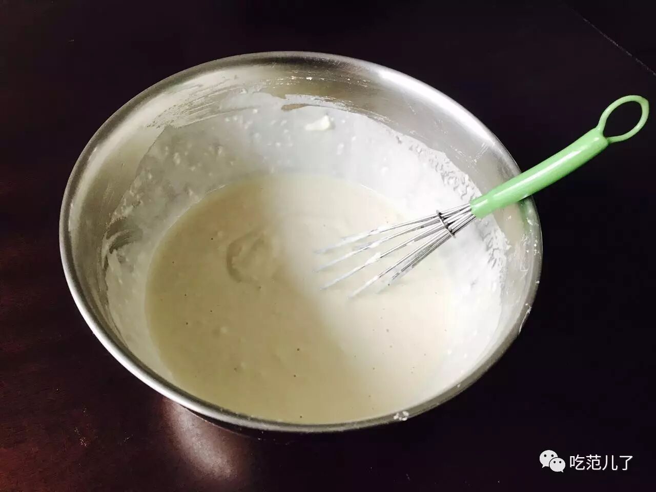 2.顺时针搅拌顺滑无颗粒面浆,用勺舀起流下的面浆可以连成一条直线不断