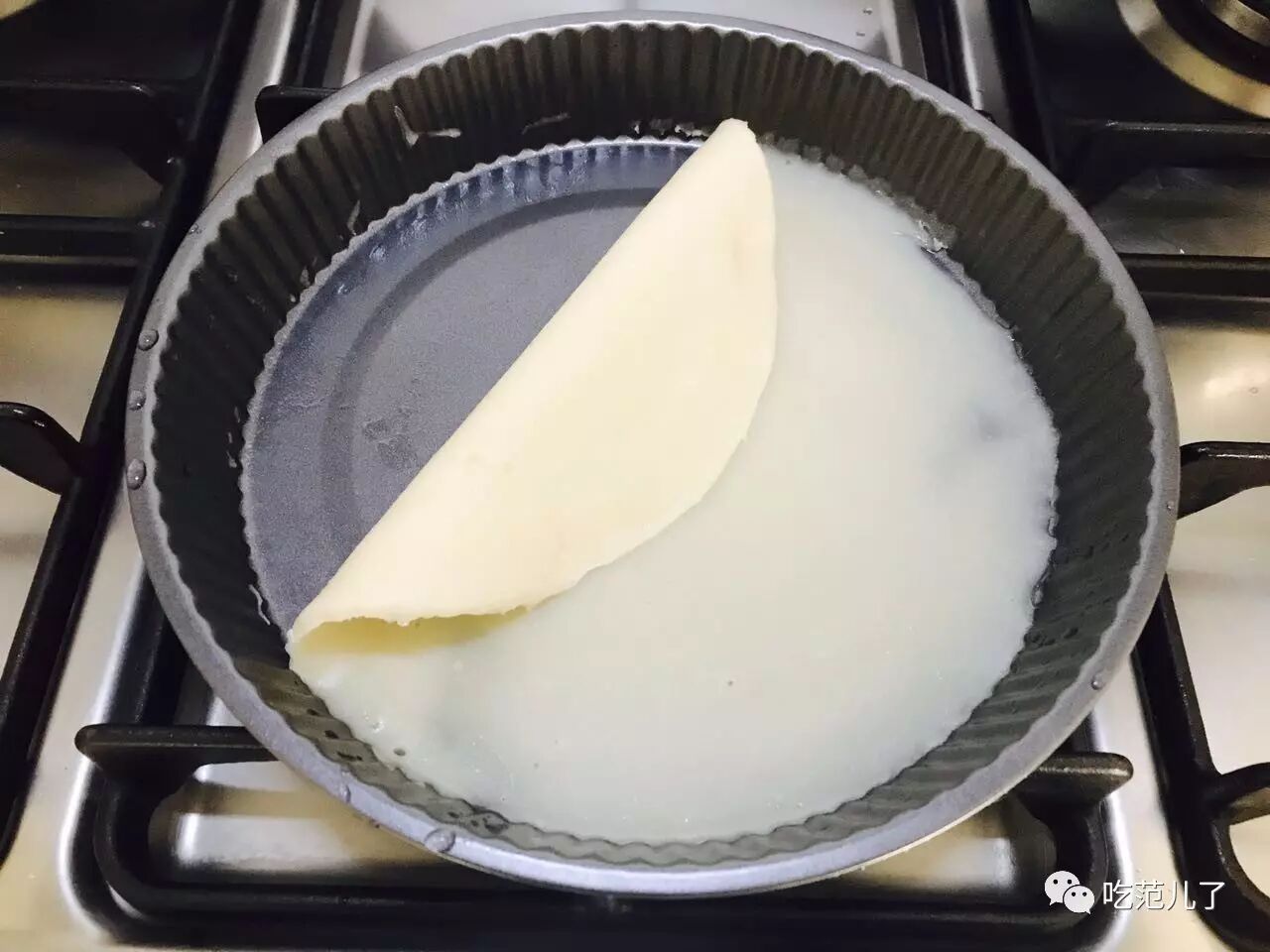 5.把烤盘放入烧开水的锅中加盖子,水温将面皮烫熟变透明状取出