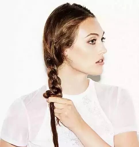 step4:麻花辫编好后,再用一只手拉住其中一股头发的末端,而另外一只手则捏住另外2股头发用力往上推,最好可以推至辫子中上位置,这样做辫子不会那么整齐,更有层次和凌乱感。