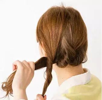 step5:将头顶的一束头发放下后进行扭转,将第三束头发拉倒下面。