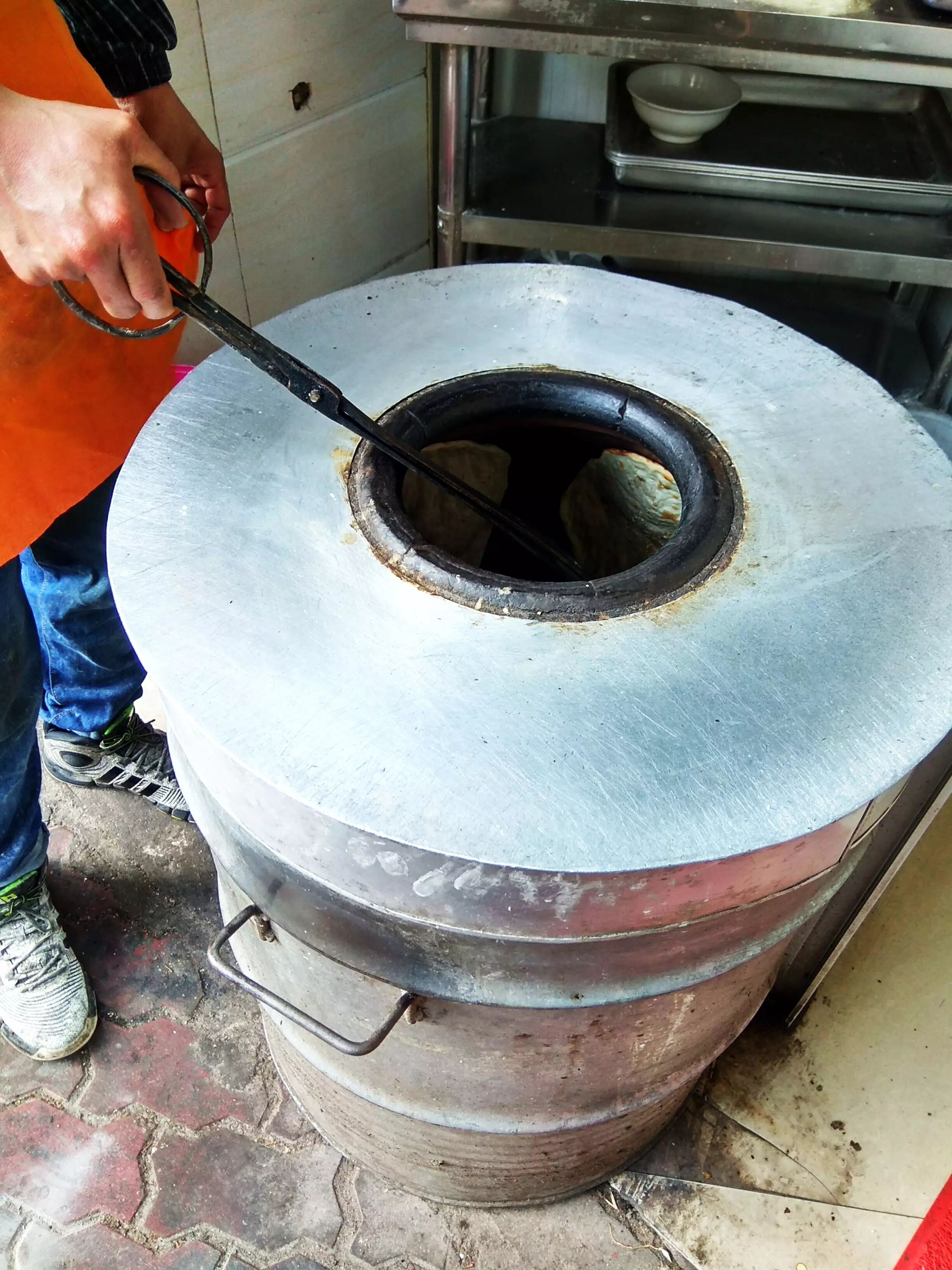 嘴里忙活,手也没闲着,面团擀成薄片,放进专门的炉子里面烘烤,很快,随着他跟我攀谈,一张焦黄薄脆的锅盔就靠好了
