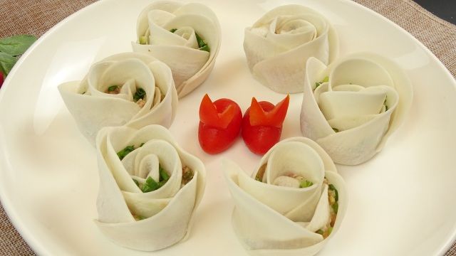 饺子是北方人的传统面食,更是除夕之夜的必备美食。今天跟大家介绍一种浪漫的“饺子”——玫瑰蒸饺。玫瑰花饺子一改传统的元宝造型,大胆改造成花式造型,让玫瑰恋上饺子,为特别的日子增添几分浪漫的味道。玫瑰蒸饺被誉为“饺子界”的颜值担当,饺子皮厚度要适中,玫瑰花饺也可以煎着吃,或者用一些食用色素或者胡萝卜汁和面,包出的玫瑰花饺就更漂亮了!取五张饺子皮,一个压一个的放,饺馅呈直线在四张饺子皮中间铺开,然后五张饺子皮对折,把饺馅盖住,从下面一点点的卷起来,在收口处沾一点水把它粘住,最后稍微整理一下,漂亮的玫瑰花蒸饺就做好了!