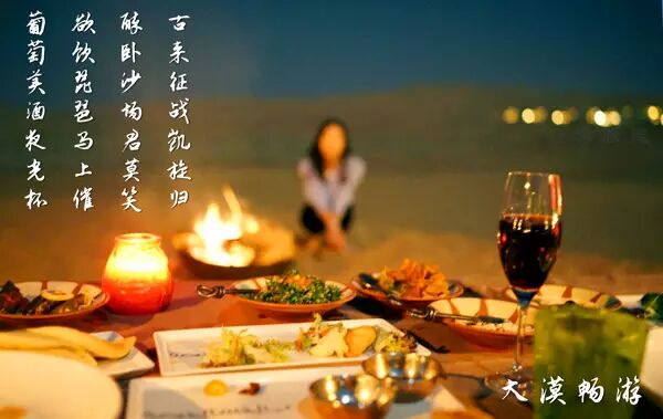 黄昏来临,观大漠落日奇观;伴随着夕阳西下,晚餐开始:羊肉臊子面,沙漠烧烤,啤酒饮料,篝火晚会,卡拉OK,露天电影...为我们的沙漠狂欢夜助兴;眼望繁星满天,斗转星移,尘世琐碎不再烦扰;徐徐凉风扫去一天的劳累,使心灵安然夜寐帐中!