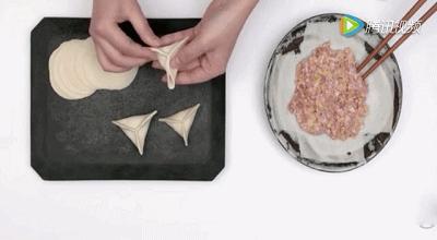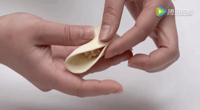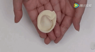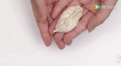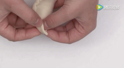 双手托住饺子皮,大拇指和食指对称,同时向饺子中间捏紧。