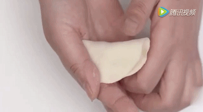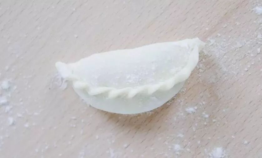 将饺子折成半圆,一手托住饺子,另一只手从左到右将饺子两侧依次以小波浪的方式往中间捏紧。