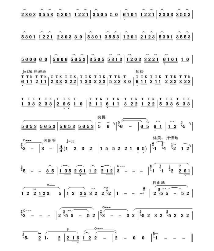 随着A段深情的相思倾诉,接着伴奏织体的改变,速度的加快,葫芦丝放开附管,使用双音演奏,节奏从稍快、激动地进而变为更快、更激动的节奏,直到推向高潮。