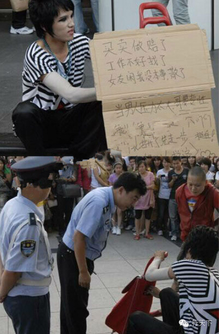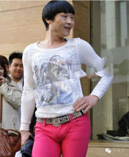 远看,他身着李孝利款白色时尚T恤和玫红色紧身休闲裤、腰系镶腰带,同时又留着齐刘海女士发型、掐着兰花指、脚踩着猫步,动作妩媚俨然一位人到中年却风韵犹存的大妈。近看,他脸上的胡茬密密麻麻,而紧身裤也更是让其男儿本色显露无疑。出现在天津闹市区,因着装“妖娆”受到众多围观。