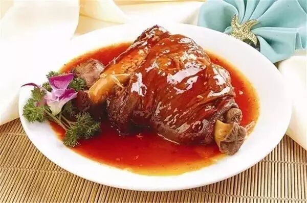 带把肘子是一道独具陕西大荔地方特色的汉族传统名菜,属于秦菜系。用猪的前腿做成的菜,做工考究,文火烧蒸,色呈枣红,形如蒲团,肥而不腻,瘦而不柴,品嚼味长,别有风味。据说在陕西大荔一带,逢年过节请客如果没有"带把肘子"这一道菜,就不能算全席。