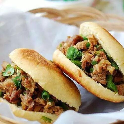 西安的肉夹馍有很多种,最出名是汉民的腊汁肉夹馍和回民的腊牛肉夹馍。陕西人所说的肉夹馍一般是指,白吉饼加腊汁肉。