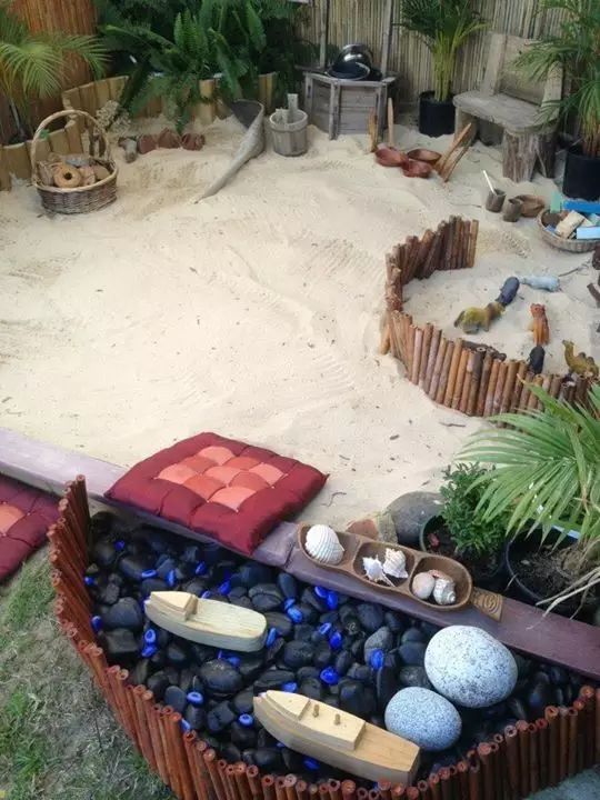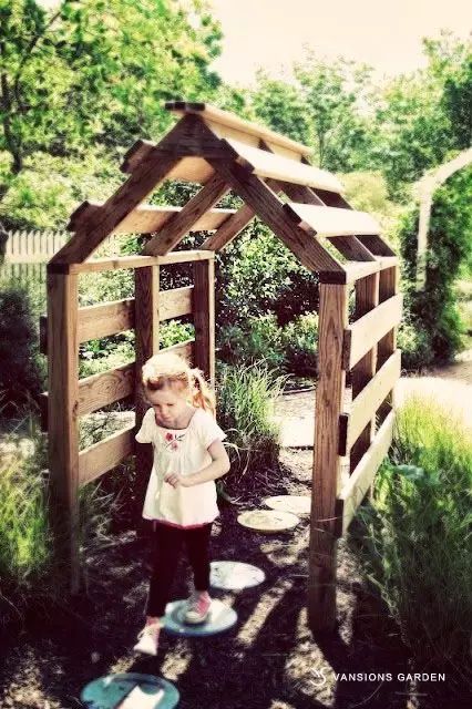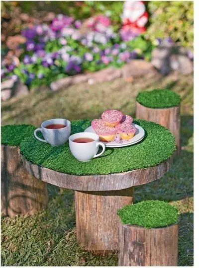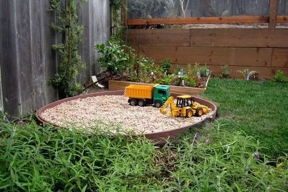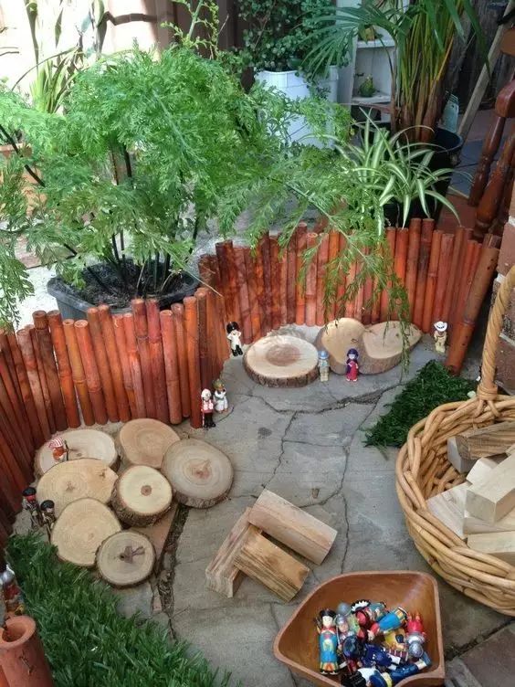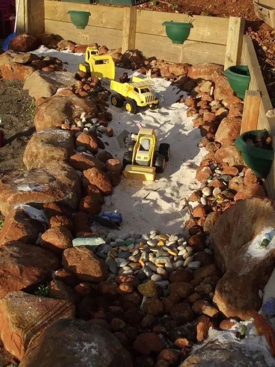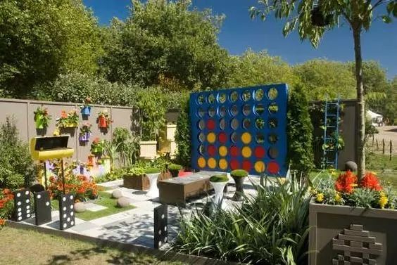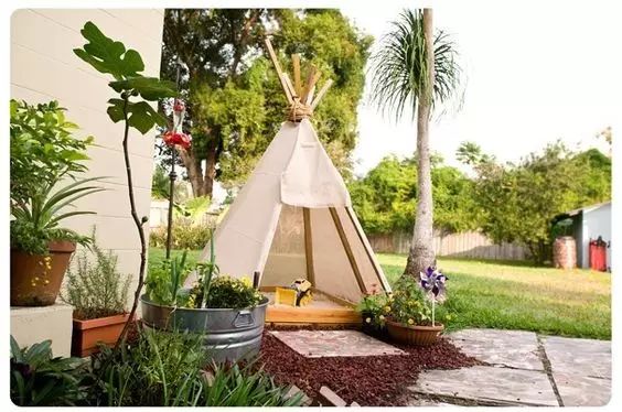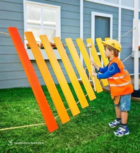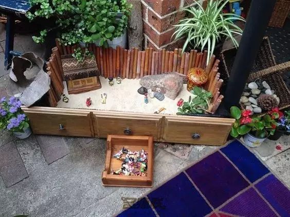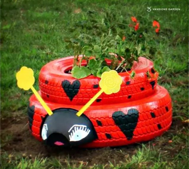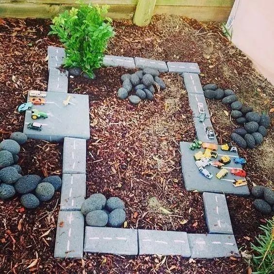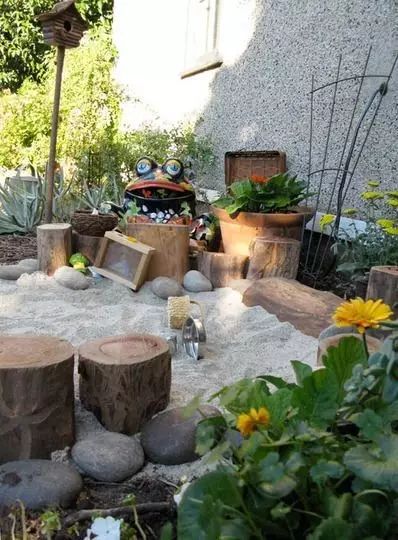 我们可以创造场景,通过DIY制作装饰品,将孩子们平时喜爱的形象或物品结合到庭院的设计中。它们可以是我们日常闲置的物品,如废旧轮胎、木板、花盆、网球等,也可以是我们随手在野外就可以找到的石块,只要有足够的想象力,任何物品都可以充当孩子们的生活玩伴。
