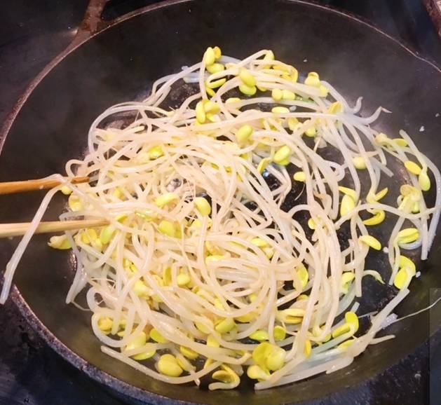 黄豆芽,用盐和香油拌均匀,下锅炒熟。