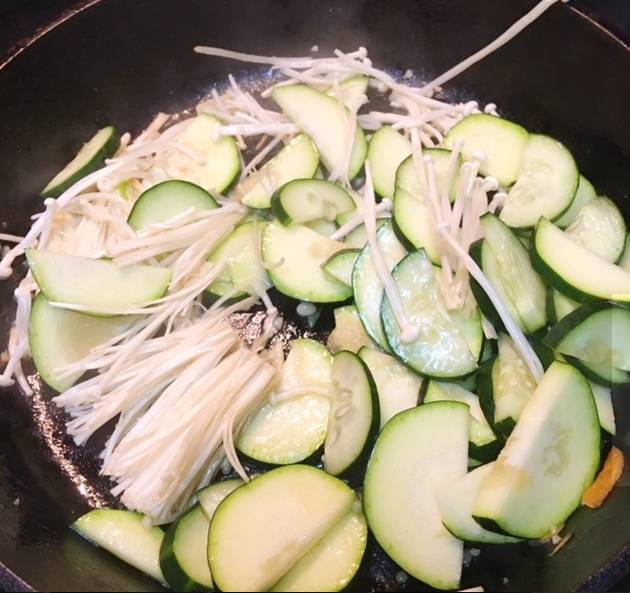 把西葫芦,黄瓜切成如图这种半圆形,用盐,蒜泥和香油拌匀,下锅炒熟。