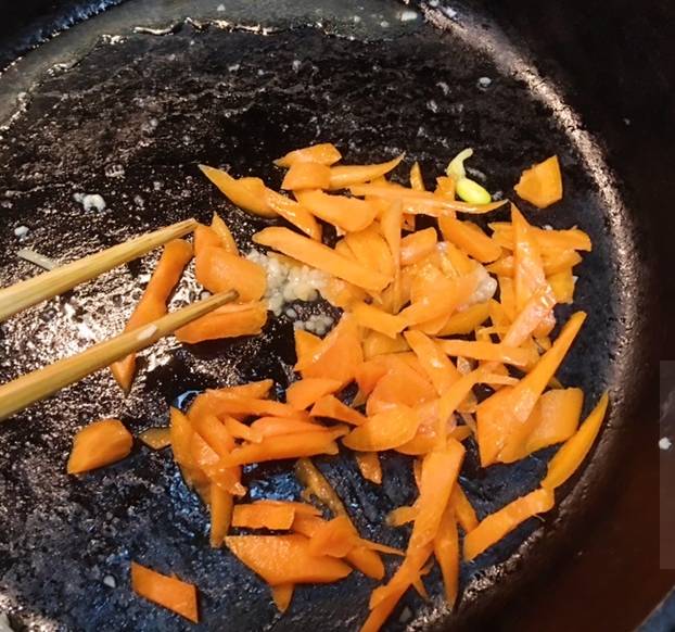 把胡萝卜丝用盐,蒜泥和香油拌均匀,下油锅炒熟。