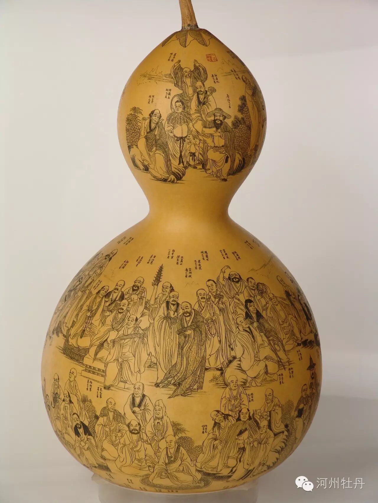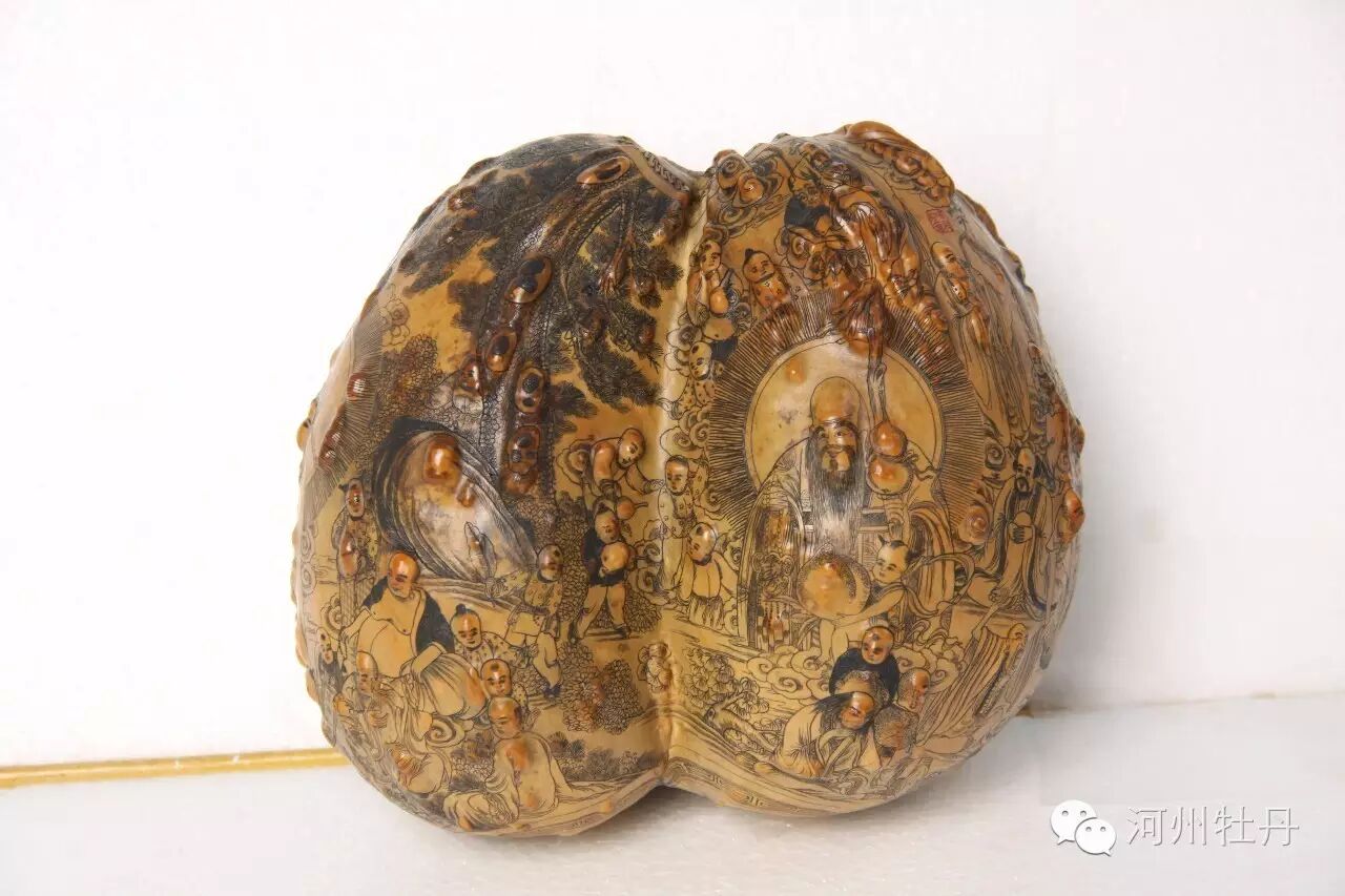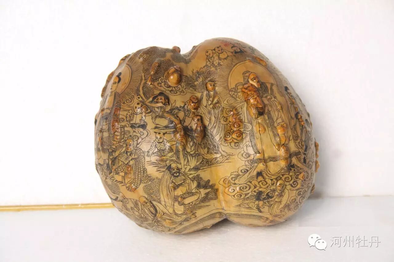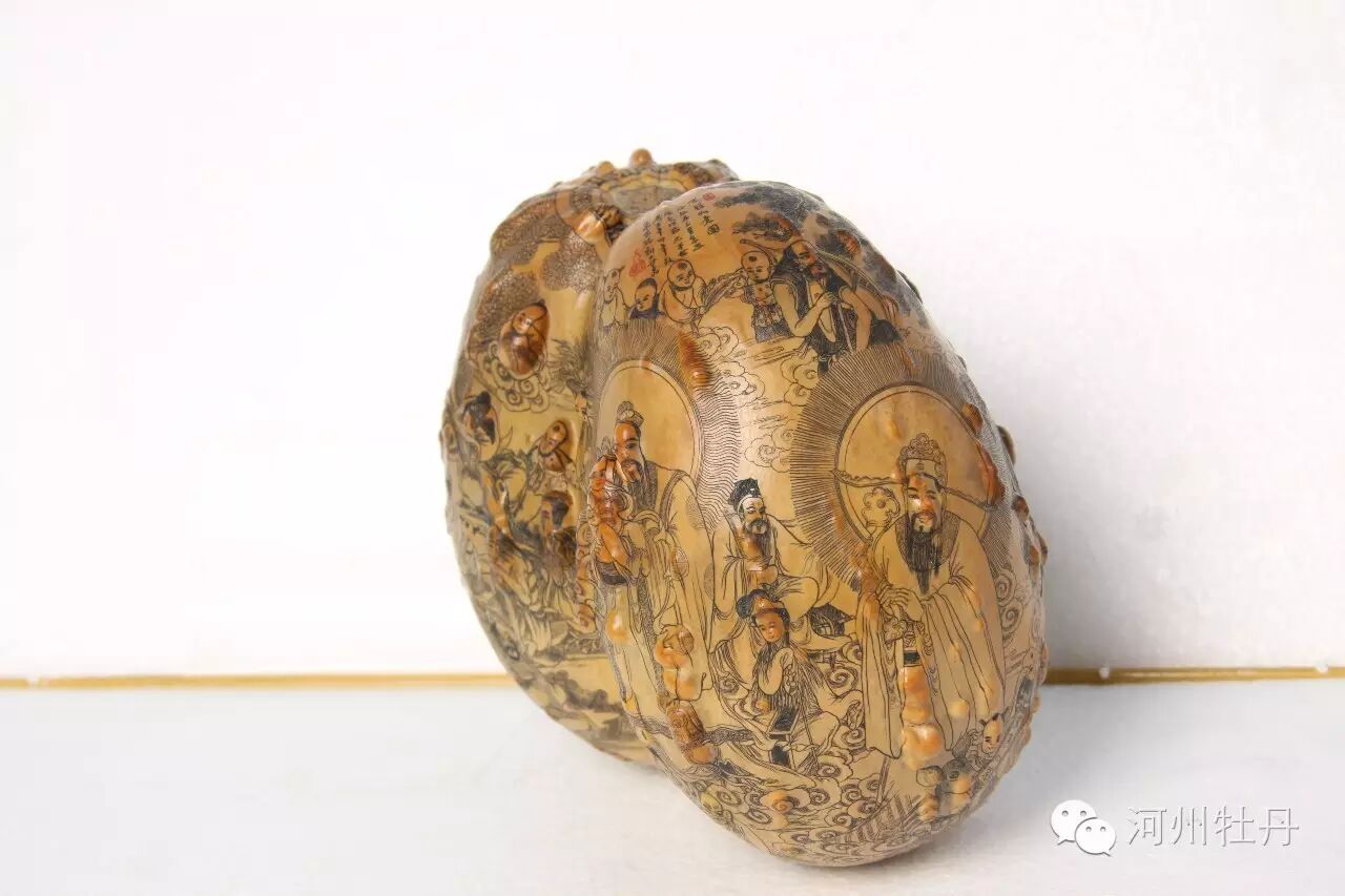 作品特点:细腻、传神、生动、构思精妙,图文并茂,情景交融,妙趣横生,布局严谨,创意新颖独到。特别是疙瘩葫芦的作品,巧妙构思,巧妙利用奇物怪异疙瘩遍布的自然形态,每个凸凸凹凹、斑斑点点都匠心安排,或作为罗汉的大背,或作为神佛的额头,或作为弥勒的大肚子,或安排为怪兽的肢体,真正达到了情趣浓郁,神态鲜活,意境传神,叫人赞不绝口、爱不释手。