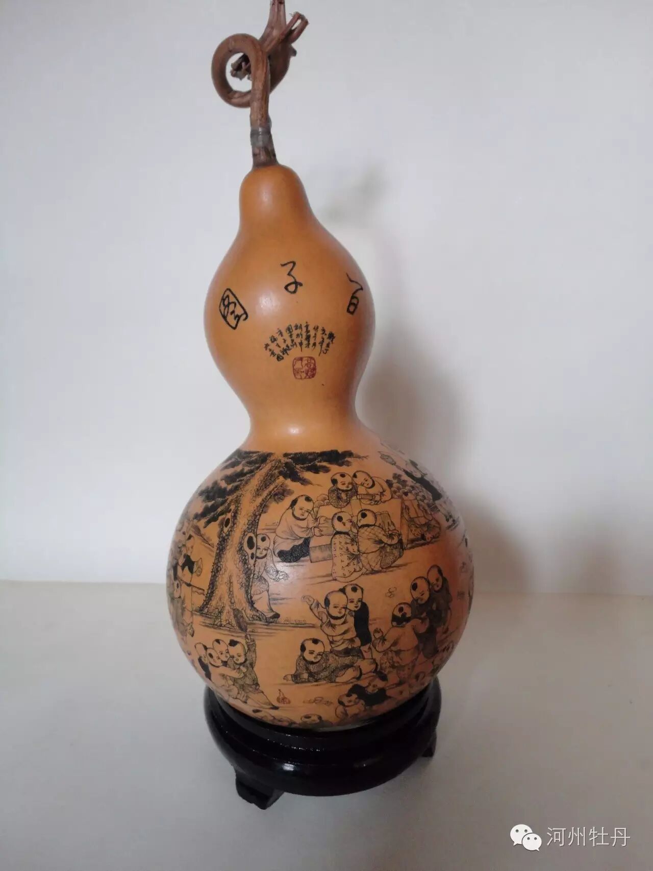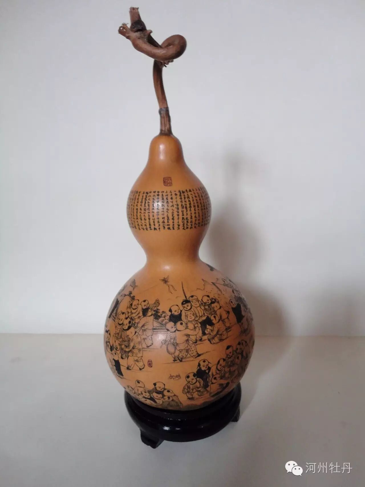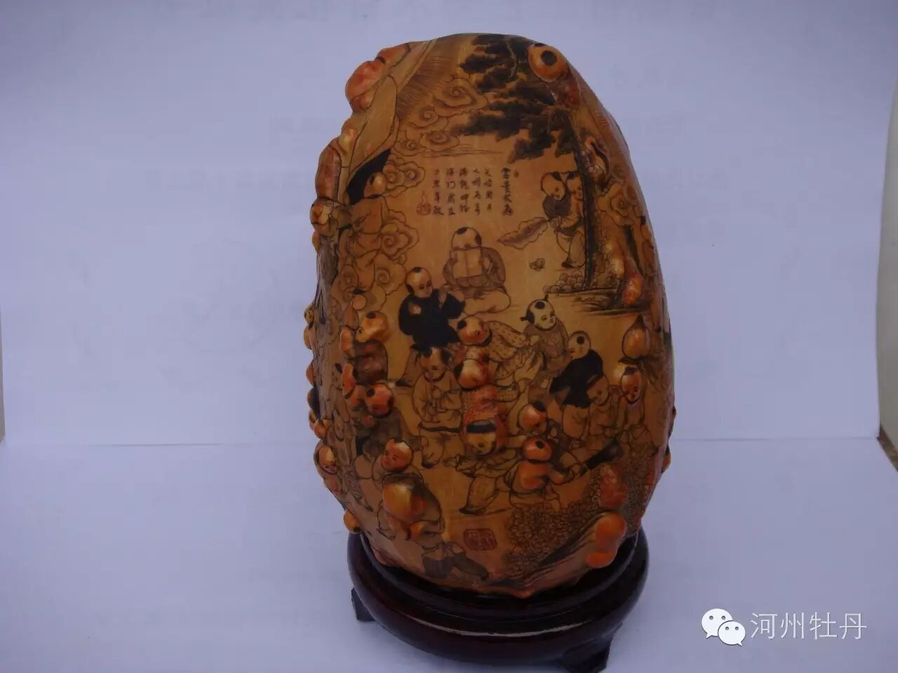 作品特点:细腻、传神、生动、构思精妙,图文并茂,情景交融,妙趣横生,布局严谨,创意新颖独到。特别是疙瘩葫芦的作品,巧妙构思,巧妙利用奇物怪异疙瘩遍布的自然形态,每个凸凸凹凹、斑斑点点都匠心安排,或作为罗汉的大背,或作为神佛的额头,或作为弥勒的大肚子,或安排为怪兽的肢体,真正达到了情趣浓郁,神态鲜活,意境传神,叫人赞不绝口、爱不释手。