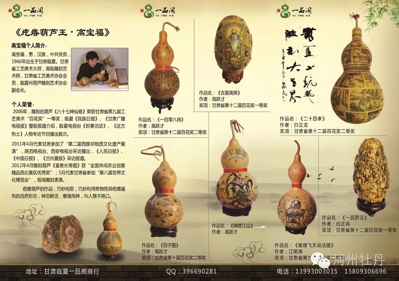 高宝福,男,汉族,中共党员,1966年出生于甘肃临夏。甘肃省工艺美术大师,高级雕刻艺术师,甘肃省工艺美术协会会员,甘肃省艺术界人才数据信息库会员,临夏州葫芦雕刻艺术协会副会长,临夏州美术家协会会员。