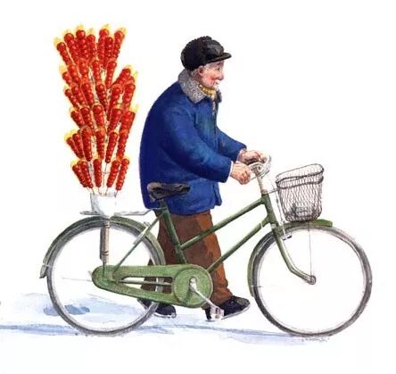 一身棉布蓝袄掖得整齐,自行车在雪地上压出弯弯曲曲的辙,后座插靶上高举的一串串冰糖葫芦红艳艳地照亮了整条街。
