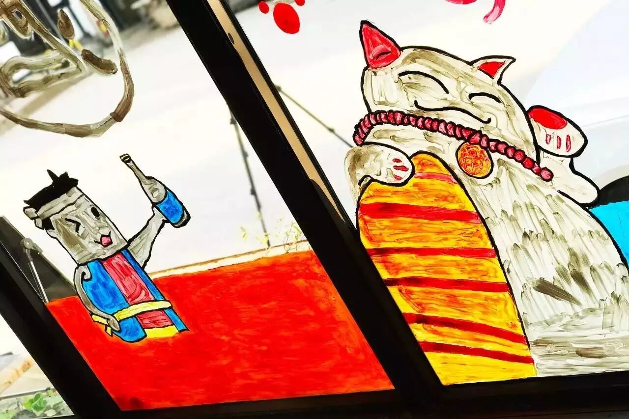 当走近了看,玻璃上的彩绘越发地可爱。光线刚好,色彩明亮,那招财喵也就越憨态可掬。而阳光正调皮,越过窗、越过门,洋洋洒洒落了一地。