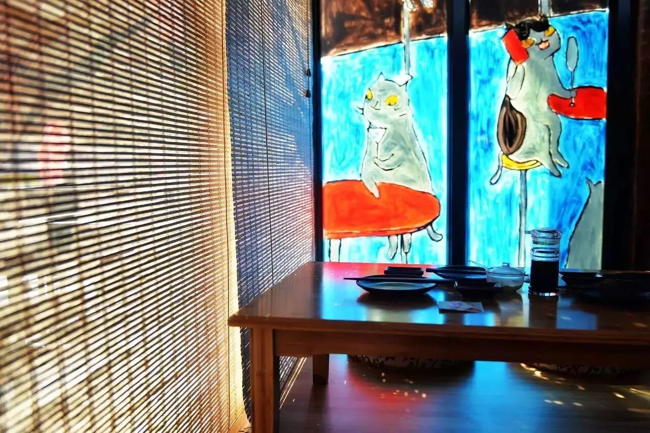 靠玻璃窗处,用竹帘作装饰,贴合着日式装修风格,也巧妙地遮了阳。此处的彩绘,结合着光,做了错落的双面绘,交错彰显着层次感。