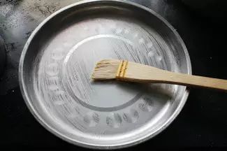 9.准备两个平底的不锈钢盘子替换着用。在每个盘子上刷一层薄薄的熟油。(熟油就是把炒菜用的油烧热后放凉)