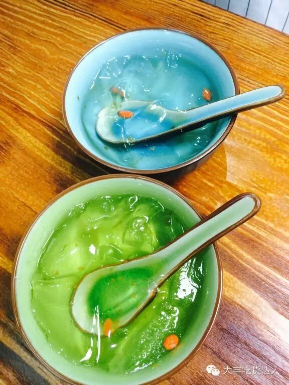 这家店最特别的是,老板给大家都准备了冰粉,中和一下,这个盛冰粉的碗特别漂亮,彩色的工艺碗中盛上晶莹剔透的冰粉,外加几颗枸杞点缀,这是一幅画!