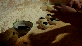 白白的面团沾上黑黑的芝麻