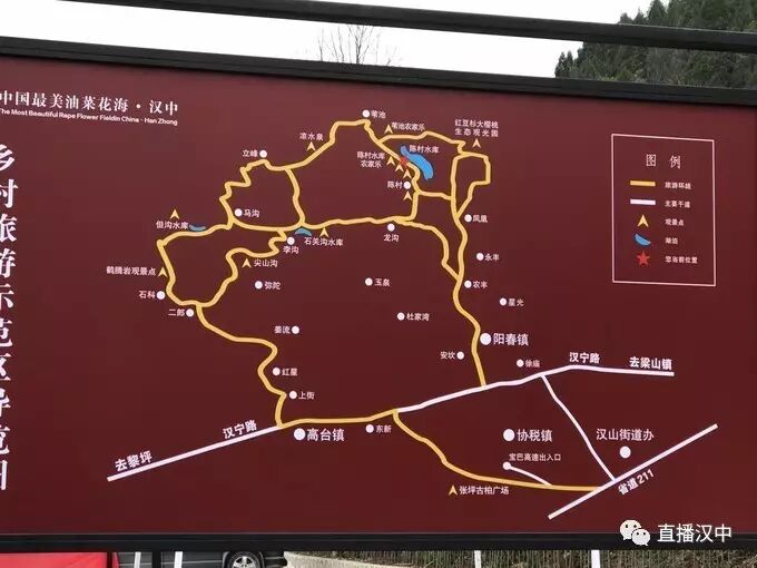 汉中油菜花节分为几个会场,今年的主会场在洋县,比较远,最近的分会场在南郑,朋友推荐去大汉山,可以俯瞰山下的花田麦垄,还有陈村水库,可以拍水边花,还有层层油菜花梯田。根据地图,我们串联了这几个景点,先去陈村。