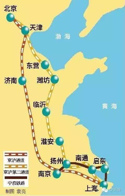北京-天津-济南-上海(杭州)高速铁路,包括南京-杭州、蚌埠-合肥-杭州的高速铁路,同时通过北京-天津-东营-潍坊-临沂-淮安-扬州-南通-上海高速铁路,连接华北、华东地区,贯通京津冀、长三角等城市群。