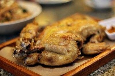 油炸时,将菜籽油烧八成热投入蒸好的整鸡,用手勺拨动,至鸡是金黄色时,用漏勺捞出,沥油,随即盛盘中,上桌时另带小蝶花椒盐佐食。 色泽金红,皮酥肉嫩,香烂味醇,筷到骨脱。
