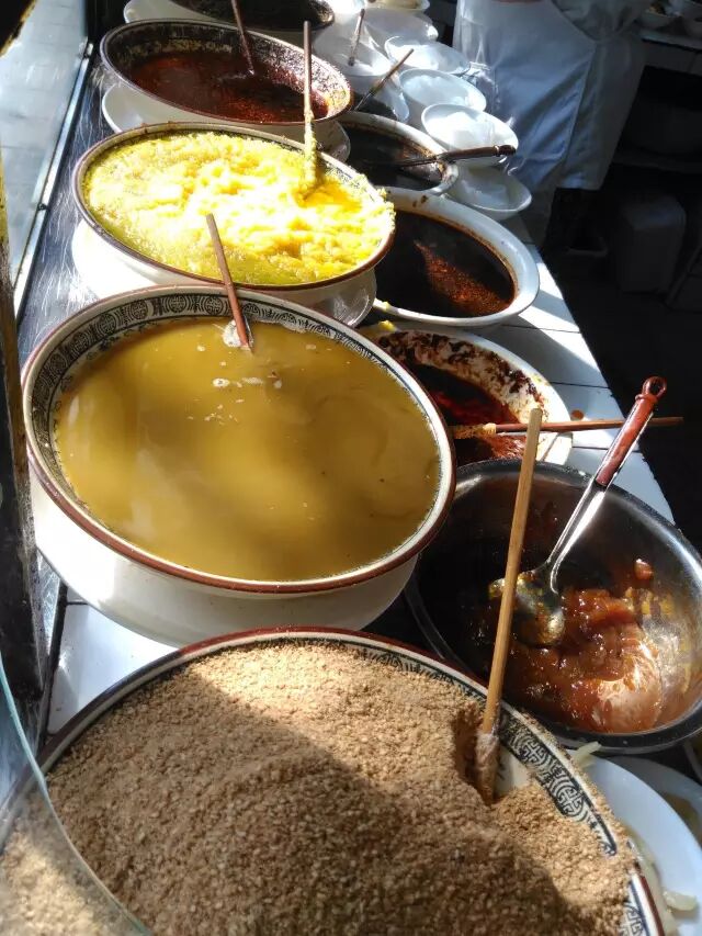 这里的豆汤分素豆汤和荤豆汤,素豆汤虽然是素的,但是喝起满口都是骨肉鲜香,荤豆汤就比素豆汤有料些,有肘子豆汤,肥肠豆汤,肉嘎嘎切成小粒粒,吃到嘴巴里QQ的,拌起米饭一起吃,再点个盐菜回锅,前提是千万别手贱买锅魁