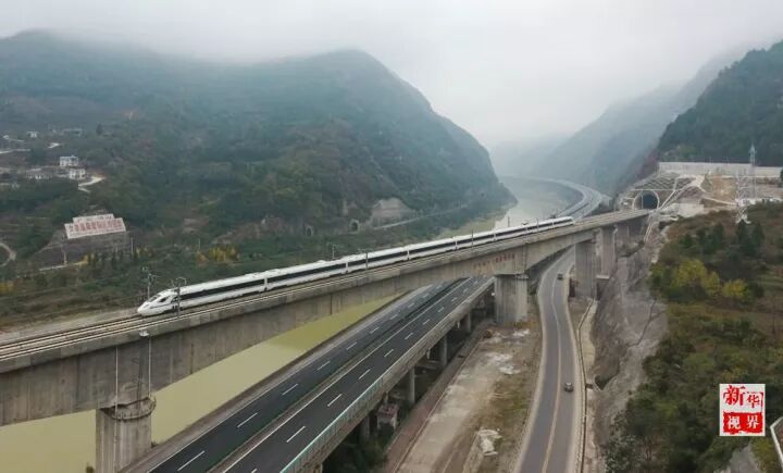 西成高铁模拟运行的CRH3A型动车组列车行驶在陕西省汉中市宁强县境内(2017年11月30日摄)。 黎德华 摄