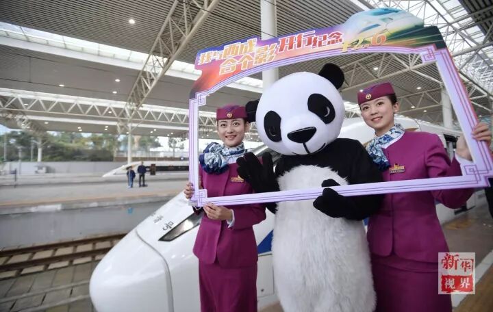 12月6日,在成都东站,乘务员和“熊猫”在发车前合影。 薛玉斌 摄