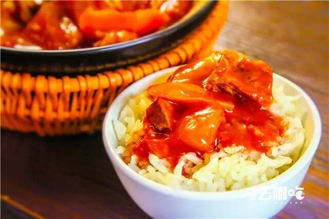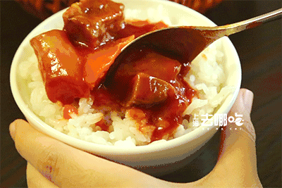 舀上一勺茄汁直接浇到米饭上,酱汁顺着碗壁缓缓流进去,香气包裹着每粒米。