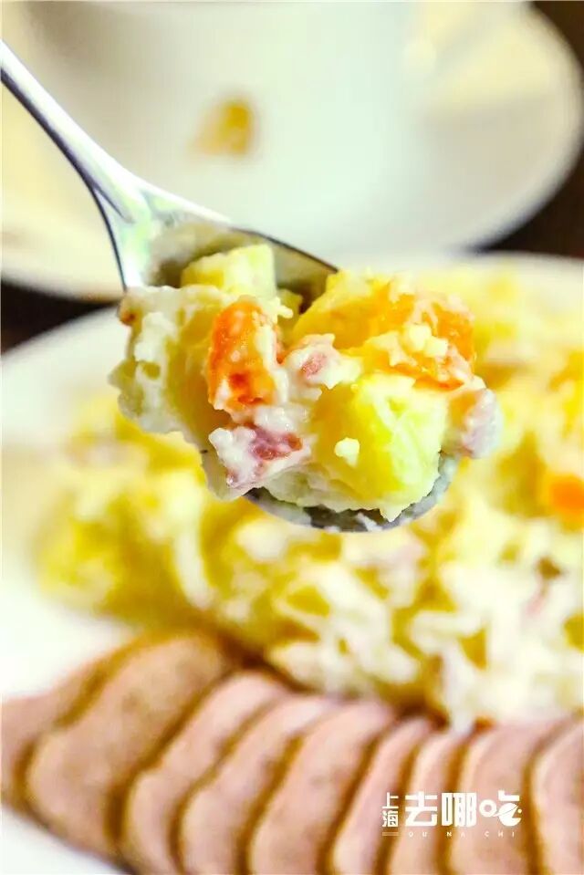 摆盘很简洁,一边是沙拉一边是牛舌,色拉主料是土豆,沙拉酱是自家用植物油+蛋黄打制而成的,香甜不腻口。