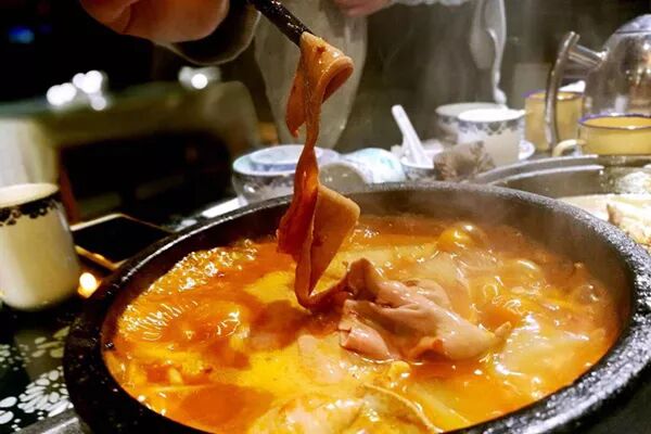 这是出场就自带节奏的特色菜,烧的滚烫冒泡的火红汤汁,盛在石锅中上场,倒入一碗片的极薄的猪腰片,瞬间翻滚沸腾不断,浮浮沉沉只需十五秒,捞出腰片就能吃了。