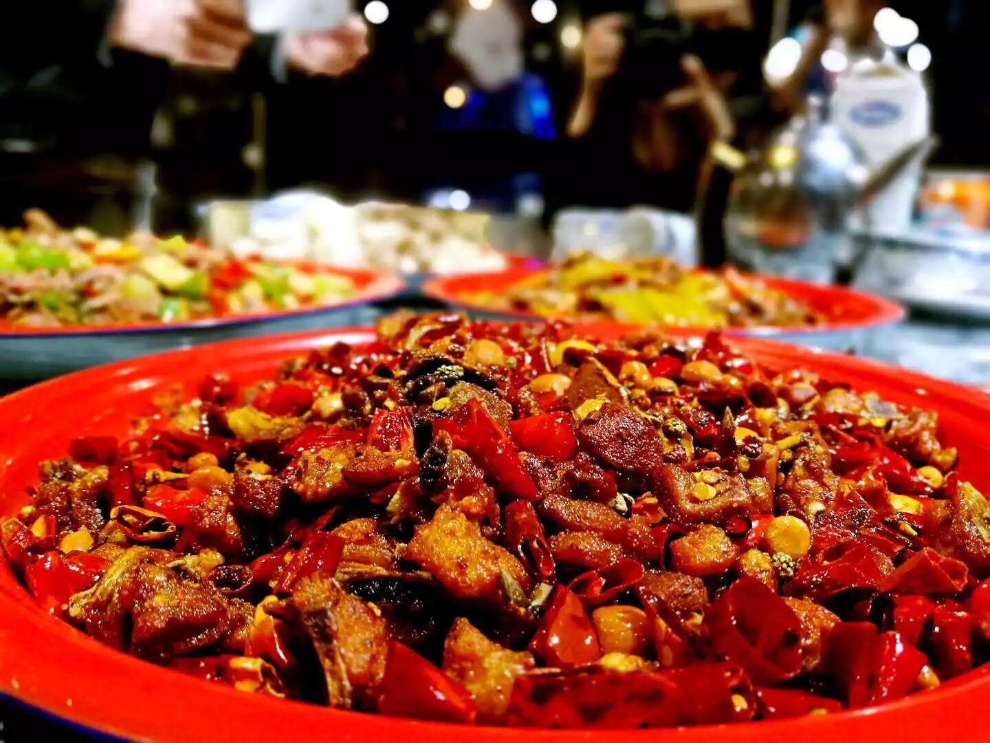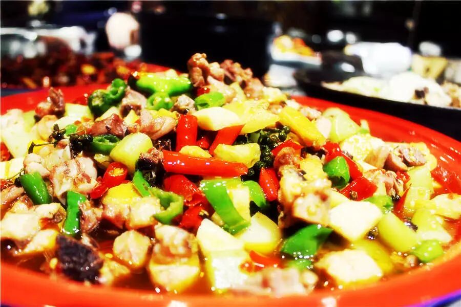 这道是重庆江湖菜,选用了四川汉源的藤椒,陕西韩城的大红袍,还有泡椒小米椒等各色尖货,原本就嫩滑的土鸡块在这层层包裹之中,每个缝隙都被渗透,加上搭配的青笋山药丁,保证你从舌尖辣到喉头,再到每一个毛孔。不过你放心吃你滴,咱这是纯正的辣椒香味,越吃越辣,越辣越想吃。
