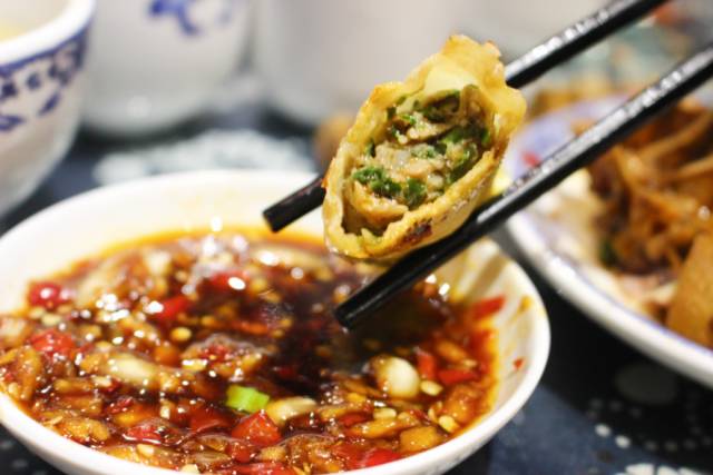边角处酥酥的,咬开软软的外皮,大团的青菜和肉馅就滚出来了,蘸着辣子水一口一个,嗯,hin满足!