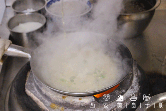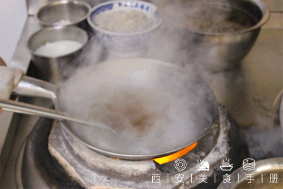 泡馍之所以如此美味,化油绝对是一大功臣!头一天羊汤煮好后,将羊肉撇出来,倒进锅里用小火熬去水分;第二天走菜时煮羊汤要 “三开”,每开一次便要淋一次化油,这样,“油”的香味就能充分的融进馍中,鲜香油润,嚼劲十足!