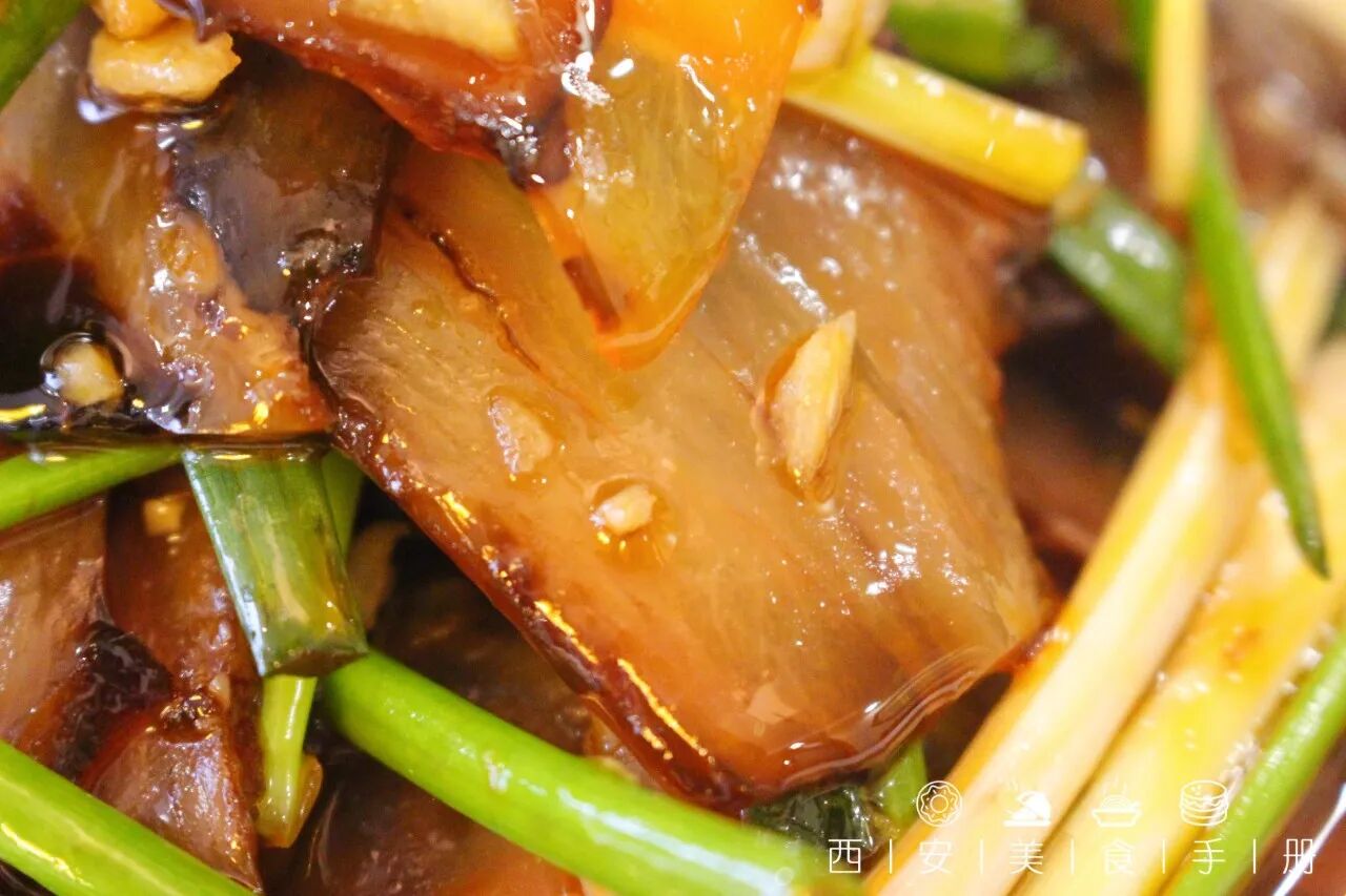 采用牛腱子部位,肉质色泽酱红,口感紧实;牛肉中夹杂着少许牛筋,鲜黄透亮。夹起一片放在嘴里咸味适中,肉香浓郁,非常适合几个老陕坐在一起下酒吃。