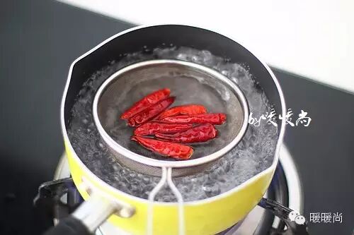 1.干红辣椒洗净,用热水汆烫半分钟捞出控水。