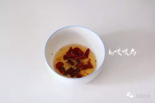 4.将处理过的干辣椒剪成段,同花椒放在耐热容器内。花生油烧至冒烟后关火静止10秒,浇在干辣椒和花椒上作为辣椒油。