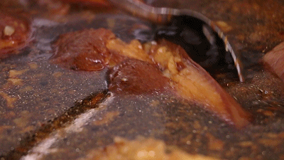 一个正宗的肉夹馍,有且仅有腊汁肉!肉要精挑细选优质五花肉,配上十多种调味香料,熬制六个小时左右,卤制出独有的腊汁肉。