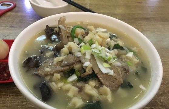 他家的羊肉泡馍也很好吃,羊肉泡馍里有不少羊肉,味儿正,汤浓。 羊肉泡馍,满满的一个二大碗,掰好的馍、菠菜、木耳,配的一小碗羊汤,一碟辣椒酱,一个甜蒜。