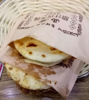肉夹馍标准的5元,全瘦的6元,一天大概能买500个,馍上来的时候热热乎乎的,外皮很酥脆,里面的肉很香~饼应该是现烤的那种脆脆的饼,里面的夹的肉是比较油的卤肉,就是咬起来,很容易流油。