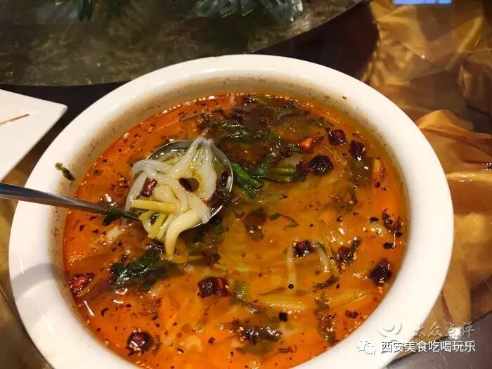 浆水搅团:给妹子的,就是传统的浆水汤加韭菜,加现打的一团搅团,搅团现打的,口感软糯,浆水酸,夏天喝很解暑的感觉。。凉拌搅团:凉拌搅团就是搅团切成块,然后加上西红柿和蒜泥搭配的汁子,上面撒上韭菜,口味酸中带香,又有蒜味,味道还是不错的,搅团也是现打的,口感软韧,不错。