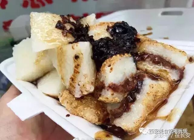 外面裹一层芝麻,中间加豆沙馅,跟蜂蜜凉粽子一样都是用江米做的。可以跟蜂蜜凉粽子两搅,一份钱吃两种,淋上蜂蜜或玫瑰、桂花糖浆,吃起来筋软凉甜,夏季解暑良品。