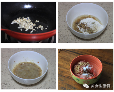 8、发面的过程中,做馅料,把猪肉剁细,再加入切细的小葱和馅料中的其他材料;