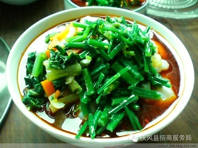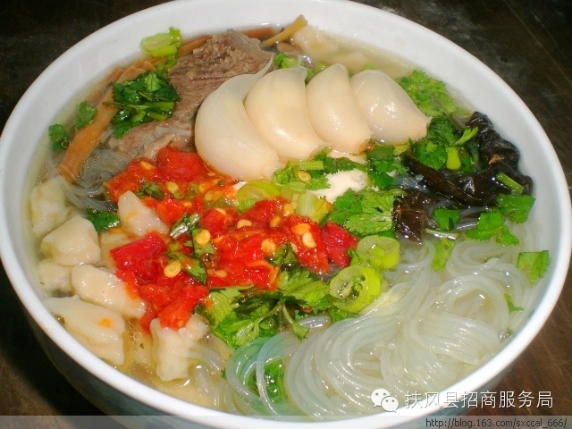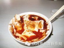 扶风面皮独具魅力,深受当地人喜爱。绿的青菜,白的面皮,红的辣油,看一看,色香味全,勾人馋虫;闻一闻,浓郁清爽,味美可口;吃一吃,又辣又香,满口生津,大人小孩个个吃得头上冒汗,嘴唇上沾满了油辣子,心里却美滋滋的,脸上笑得像花儿一样灿烂。